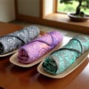 表面は美しい友禅染め、裏面は白い蚊帳生地を使用し、アクセントカラーで縁取りを施しました。